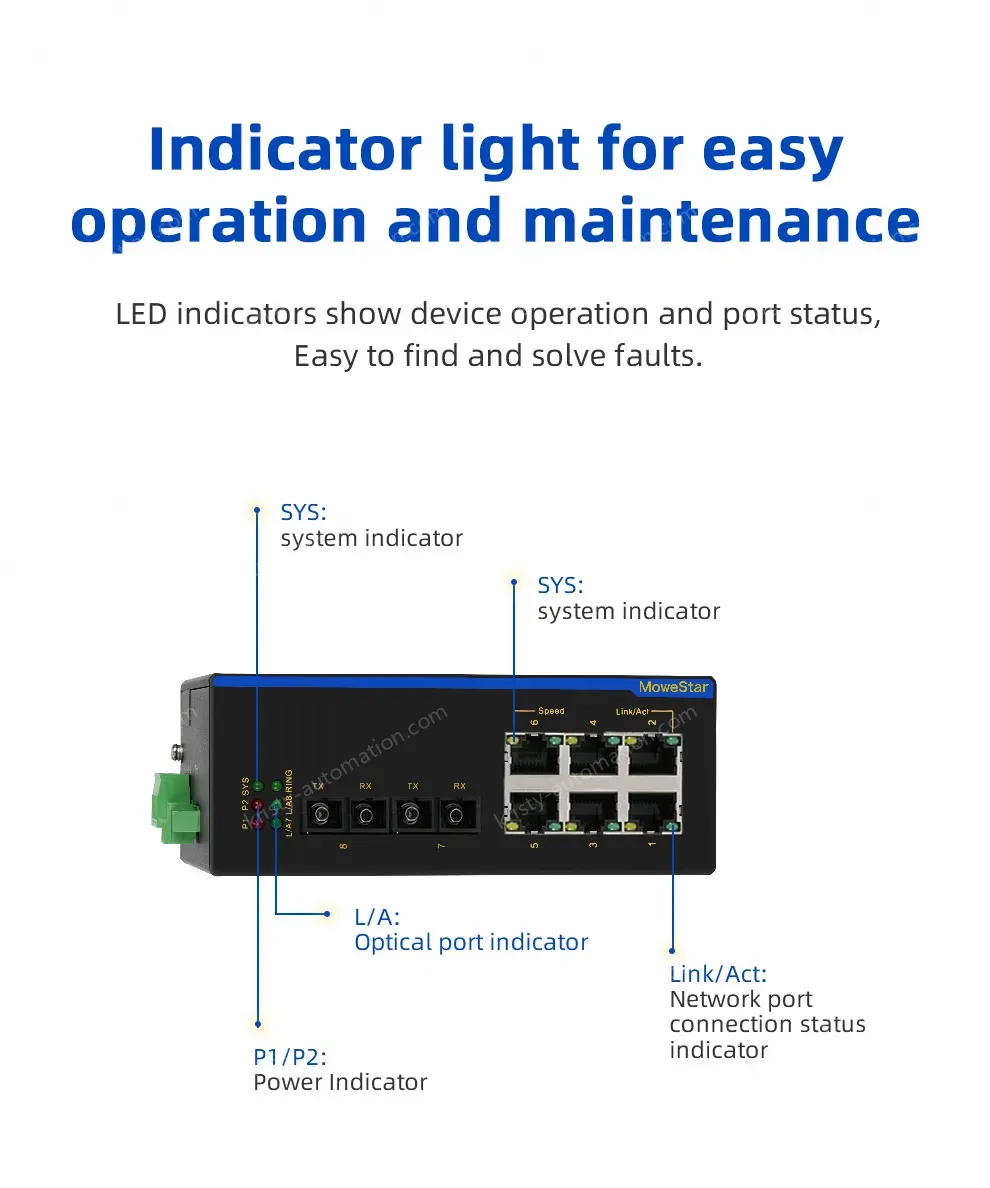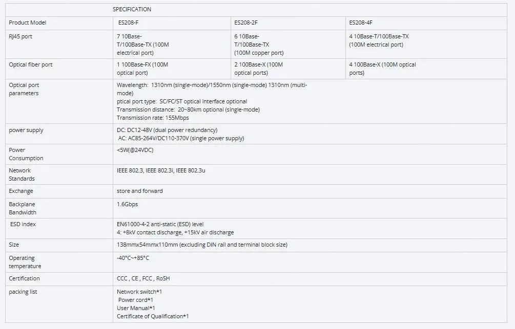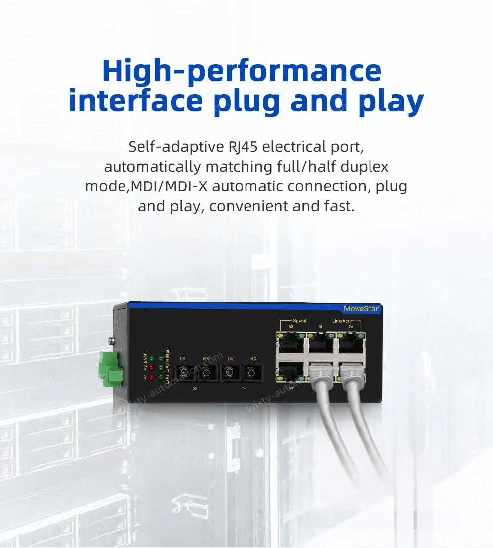 The industrial Ethernet switch adopts high-performance imported switching chip to ensure the stable transmission of large traffic data, and supports 10/100/100M adaptive electrical port; Support -40~85℃ operating temperature, industrial power protection, indicator status display, guide rail/rack installation, fan-less thermal housing design, to achieve real readout, convenient and fast, but also meet the EMC4 level protection, IP40 protection, 6000V lightning protection and other indicators, can adapt to a variety of harsh industrial environment application needs.