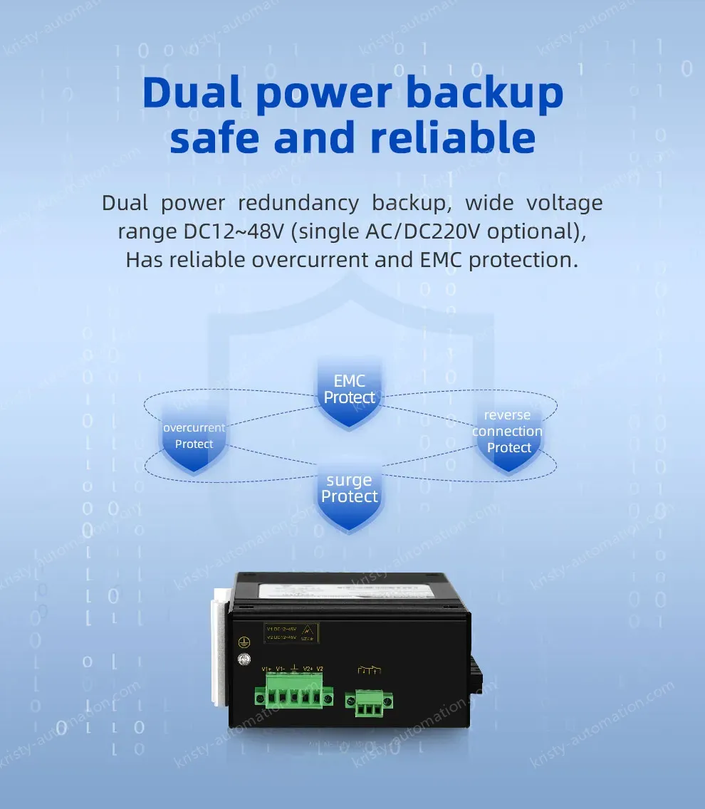 ● Supports dual power supply redundancy DC9~60V and single power supply AC85-264V/DC110-370V