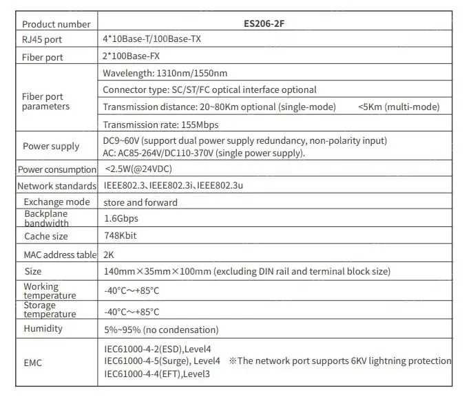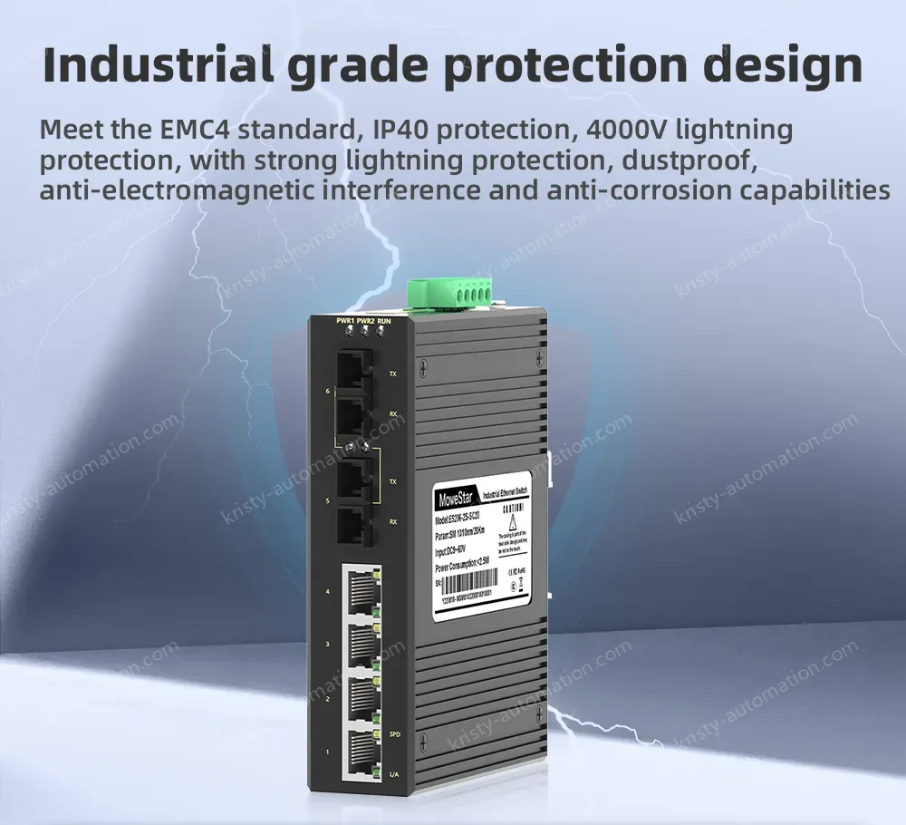 The industrial Ethernet switch adopts high-performance imported switching chip to ensure the stable transmission of large traffic data, and supports 10/100/100M adaptive electrical port; Support -40~85℃ operating temperature, industrial power protection, indicator status display, guide rail/rack installation, fan-less thermal housing design, to achieve real readout, convenient and fast, but also meet the EMC4 level protection, IP40 protection, 6000V lightning protection and other indicators, can adapt to a variety of harsh industrial environment application needs.