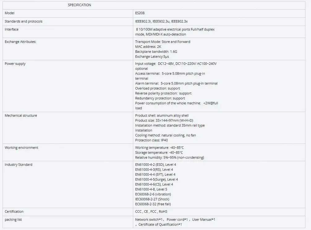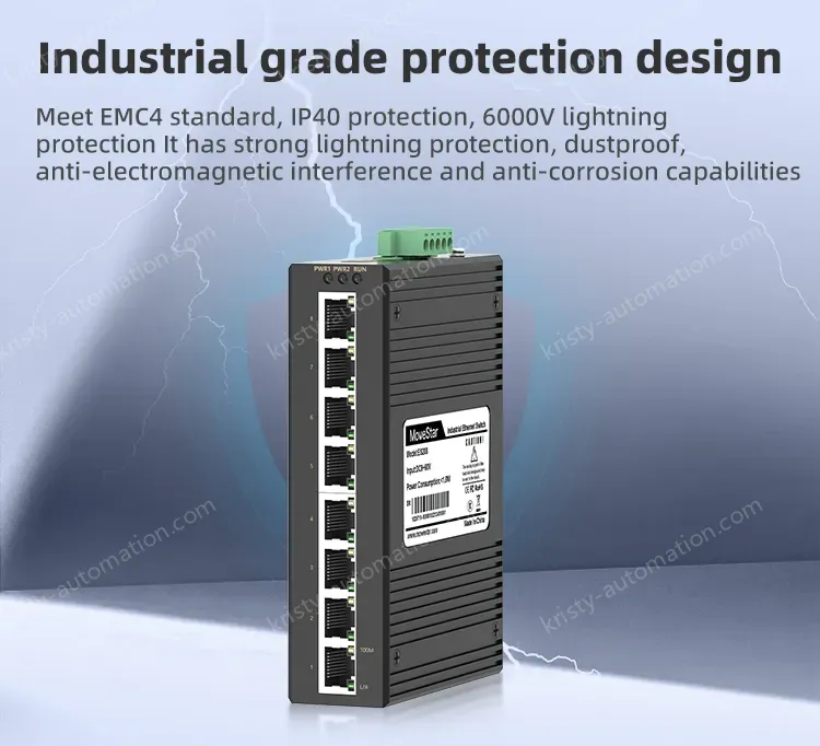 The industrial Ethernet switch adopts high-performance imported switching chip to ensure the stable transmission of large traffic data, and supports 10/100/100M adaptive electrical port; Support -40~85℃ operating temperature, industrial power protection, indicator status display, guide rail/rack installation, fan-less thermal housing design, to achieve real readout, convenient and fast, but also meet the EMC4 level protection, IP40 protection, 6000V lightning protection and other indicators, can adapt to a variety of harsh industrial environment application needs.