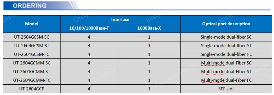 For example: UT-2604GCRSM-SC-40, “R”is receiving single fiber, “SM” is single mode, “SC” fiber interface type is SC head, “40” transmission km for 40km