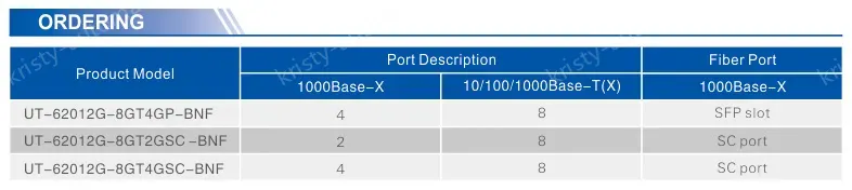UT-62012G series are full Gigabit managed industrial Ethernet switches. To meet different industrial field requirements, it adopts modular structure design, supports up to 4 Gigabit fiber ports and 8 Gigabit RJ-45 ports, this enhances the networking flexibility. This series supports port mirroring, VLAN, igmp, QoS, Stp/Rstp/Mstp, ACL, and other management, such as Console, Telnet, Web, SNMP, and relay alarm output. It provides safe and reliable solution for industrial automation, intelligent transportation, video monitoring, and other industrial application networking access.
