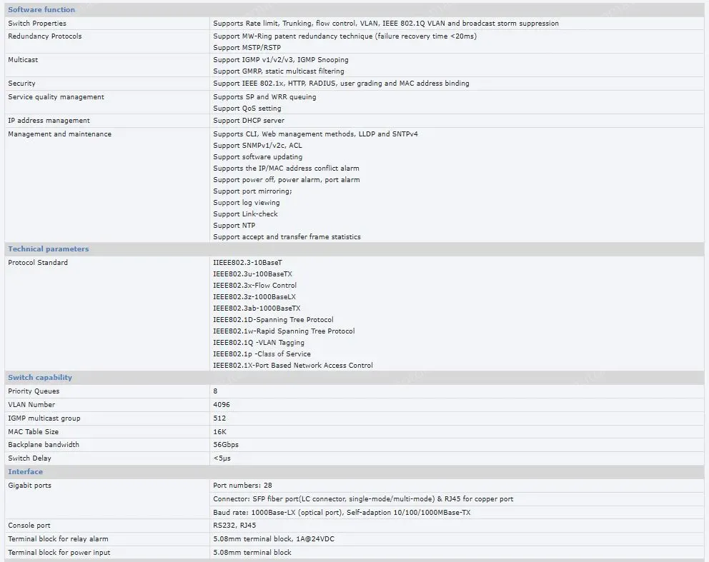 Star management industrial switch product series is rich, port configuration is flexible, products are made of high-performance industrial switching chip, with strong anti-interference performance; Industrial wide temperature design, to meet the stable and reliable operation in industrial environment; Support power redundancy backup, using private ring network redundancy, fault self-healing time is very short
