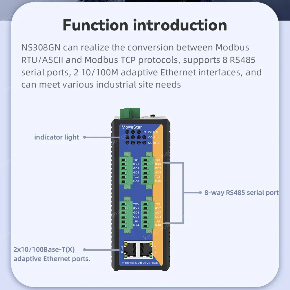 ● Serial ports supports up to 256 modubus TCP Client connections and 128 modubus TCP server connections