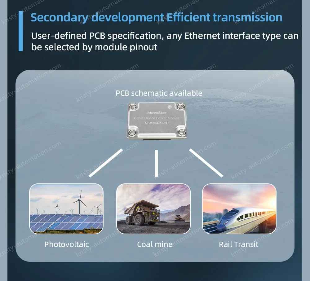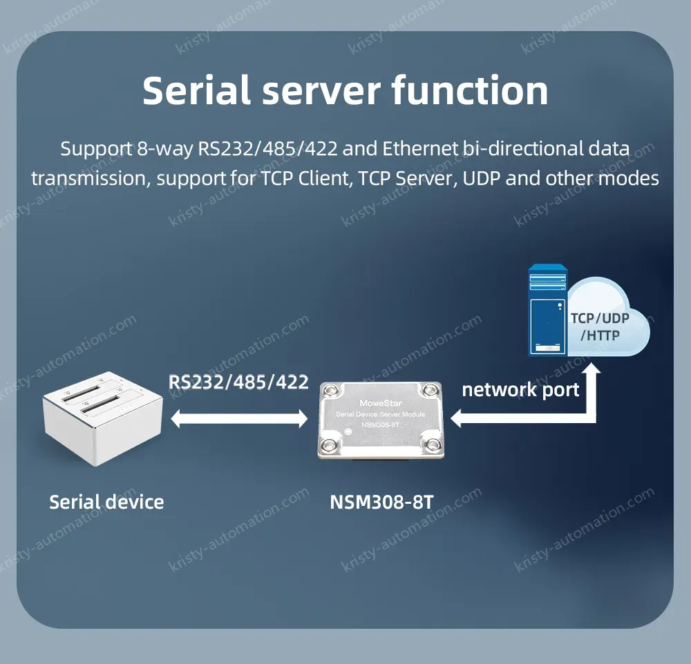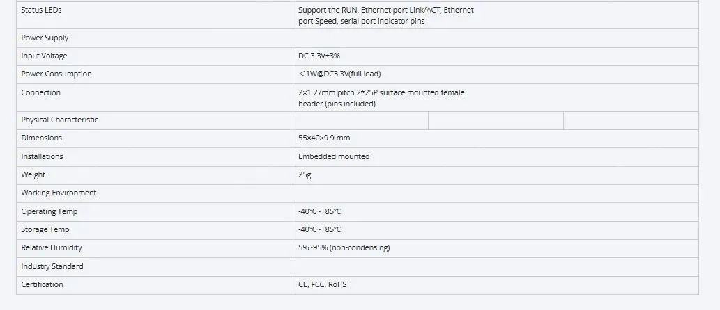 Industrial serial port server series products, mainly realize the data transmission between Ethernet and serial port (RS-232/RS-485/RS-422), it integrates the TCP/IP protocol stack, RS-232/RS-485/RS-422 devices that are not connected to the Internet can also be easily, flexibly and quickly connected to Ethernet. The series of products use high-performance ARM chip to ensure stable data transmission; Support a variety of working modes to meet different application requirements; Excellent anti-interference performance, suitable for harsh industrial environments.